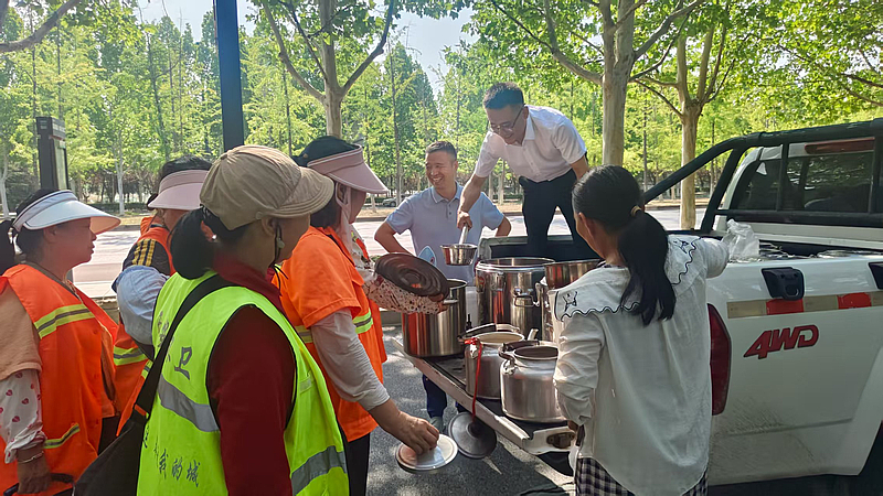 考虑到环卫工人分布广、作业点分散的特点,除固定补给点外,沣西集团服务公司还安排专人驾驶三轮车穿梭于新城各个保洁区域,将一碗碗绿豆汤送到正在作业的环卫工人手中,确保每一位户外劳作的“城市美容师”都能喝上一口清凉解暑的绿豆汤。
