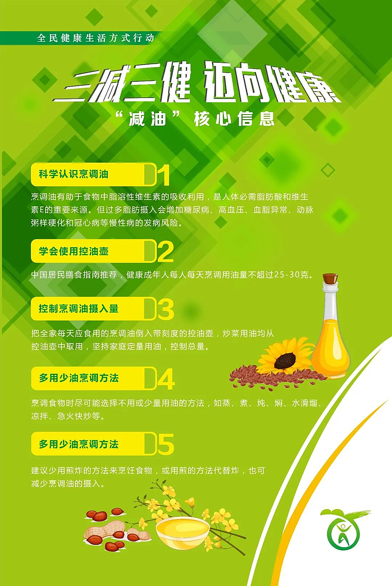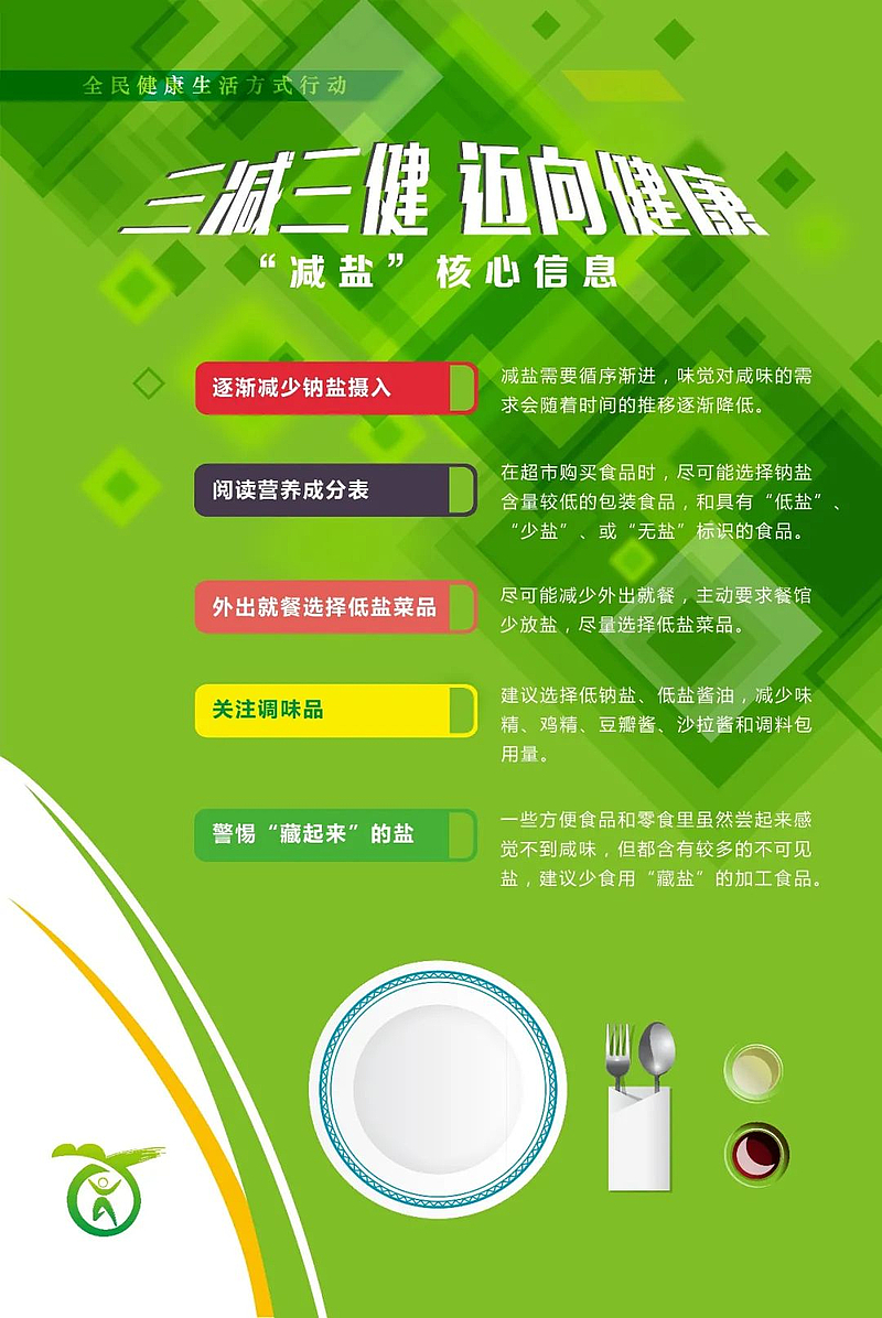 “三减”即减盐、减油、减糖,作为生活必需的调味品,如果摄入过量,可能会导致慢性病的发生,其对健康的影响不可小觑。