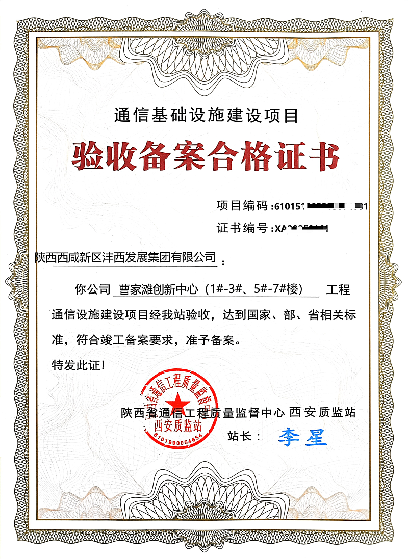 陕西沣西科创发展有限公司(以下简称“沣西科创”)承担了曹家滩创新中心三网融合宽带通信设施建设工作。为了确保顺利验收,沣西科创组织项目团队从经济性、科学性、拓展性以及兼容性四个方面对项目进行反复论证,提供了最优的设计方案,同时在施工过程中打通了机房标准化建设及网络部署等关键环节技术难点,打造了一个稳定、高速且具备高度可扩展性的通信基础环境,为更多科技型企业入驻后开展智能化生产、远程运维等高带宽、低时延业务打下了坚实基础。