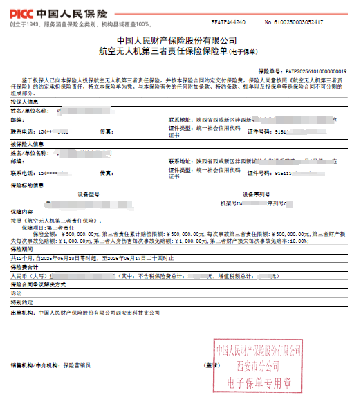 该保险为投保企业提供了30万元的风险保障,主要针对无人机在试飞过程中可能对第三方造成的人身伤害和财产损失进行赔付,不仅帮助企业有效转移潜在风险,也为周边居民和单位的安全提供重要保障。